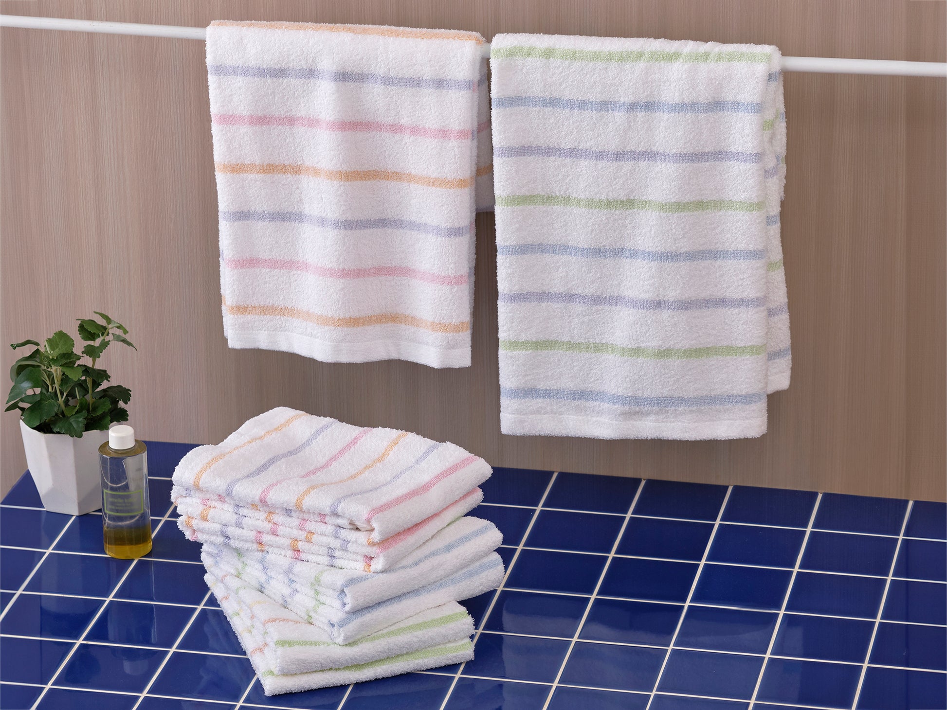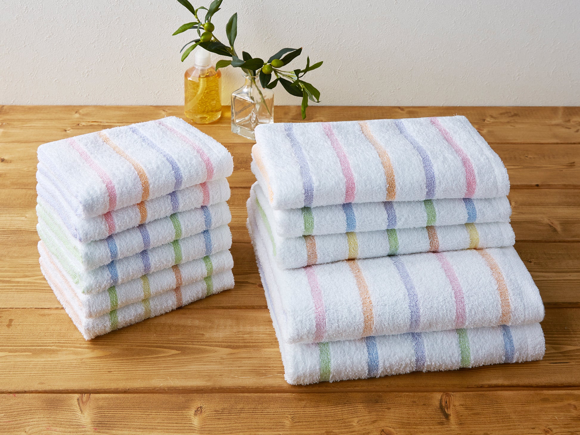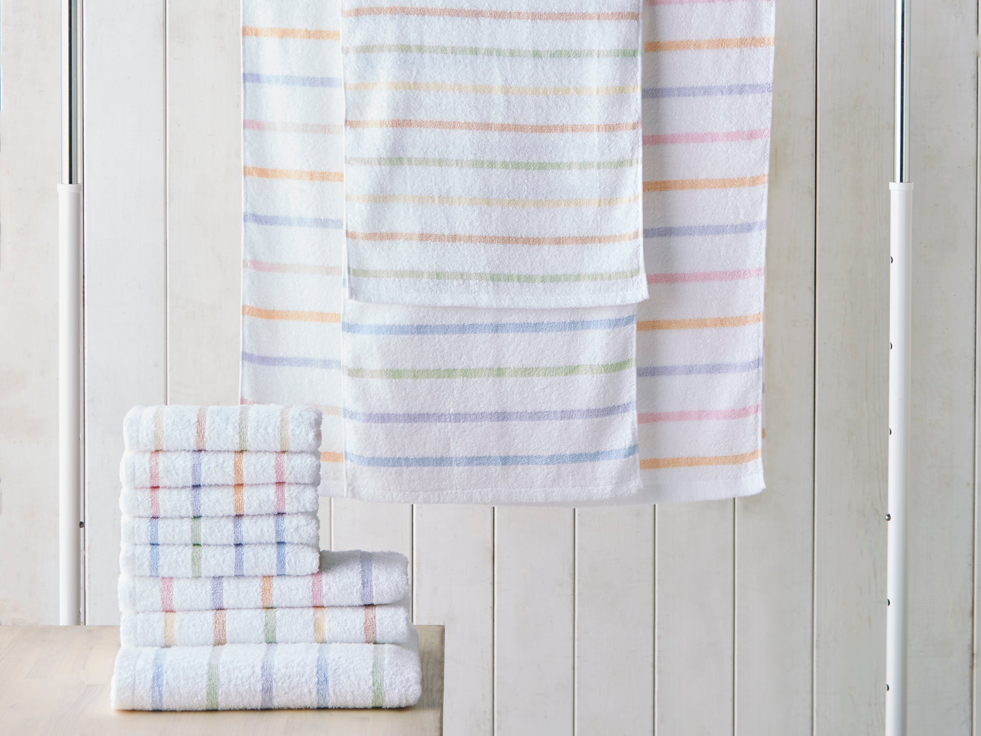 まいにち使いたくなるほど良いボリューム感と、白を基調とした、さやわやで清潔感のある印象のボーダータオルだからこそ、日々の暮らしも爽やかでいたい。