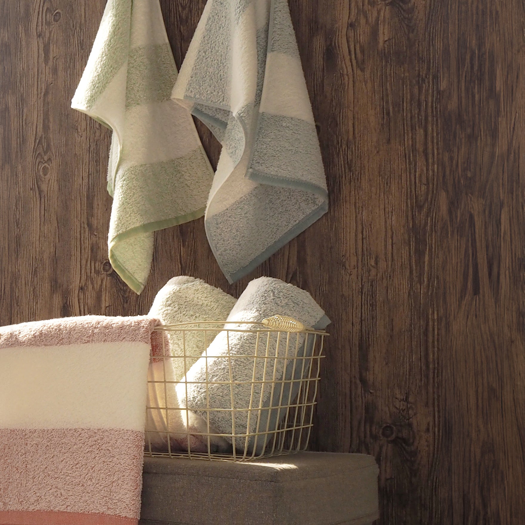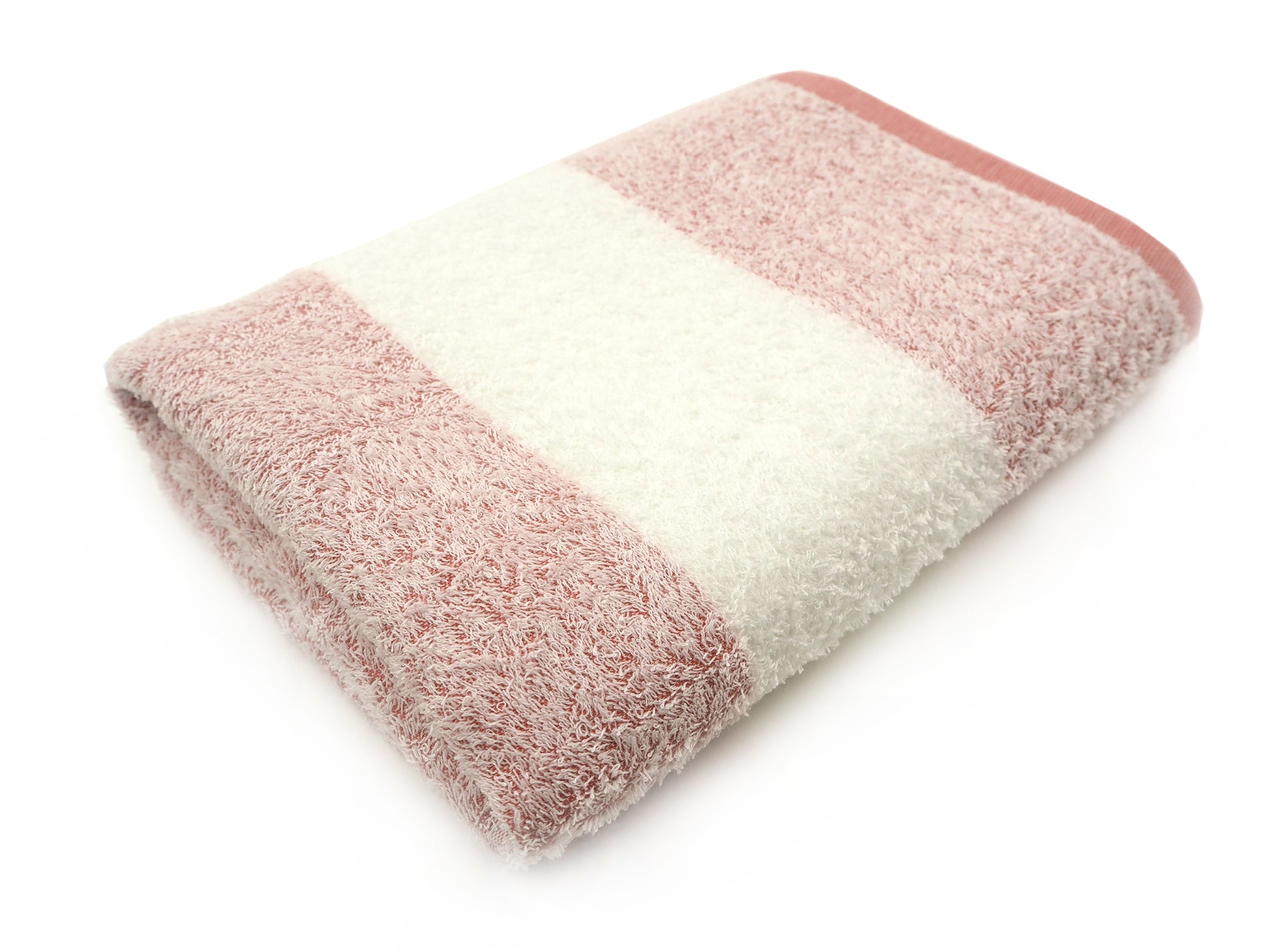 白いパイル糸越しに、ほのかに浮かぶカラーボーダーでおしゃれ度アップ!泉州タオルならではの透かし織りを取り入れたタオルです。
