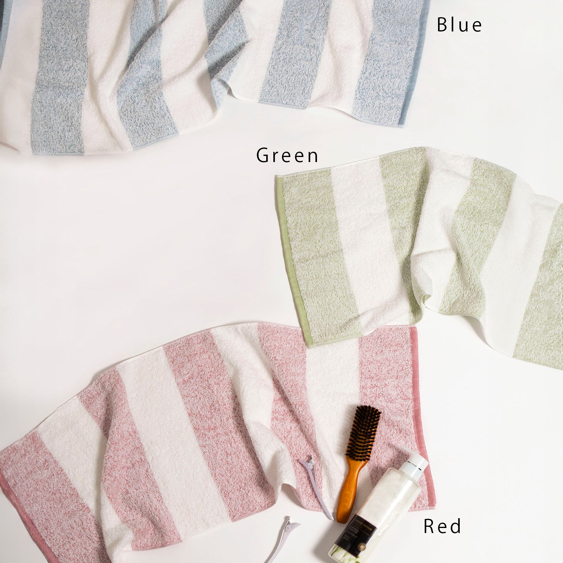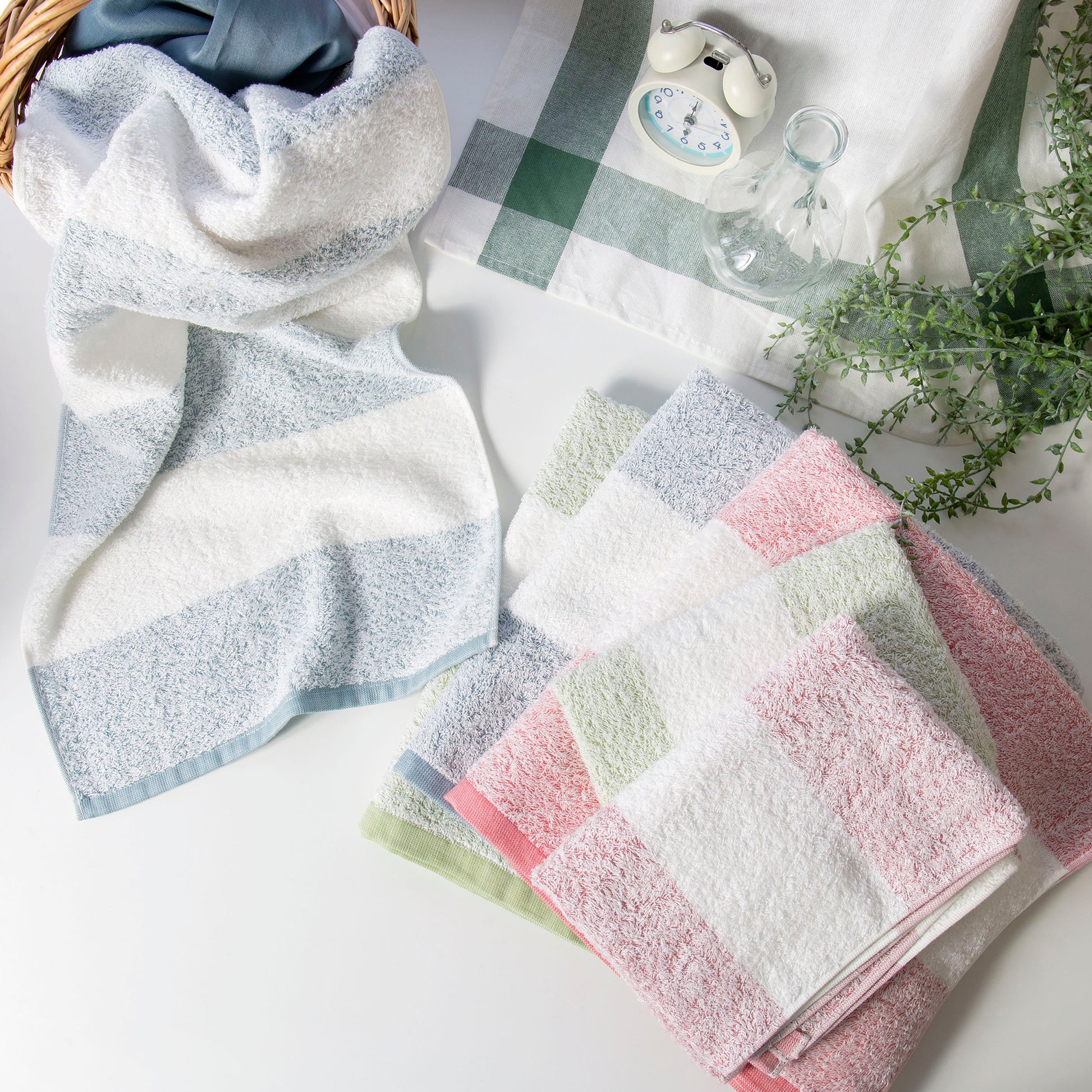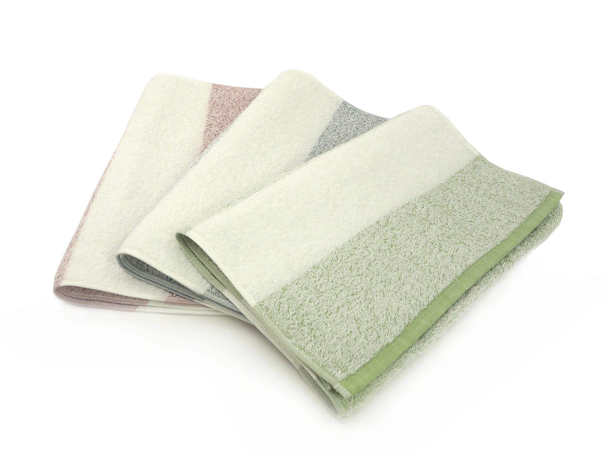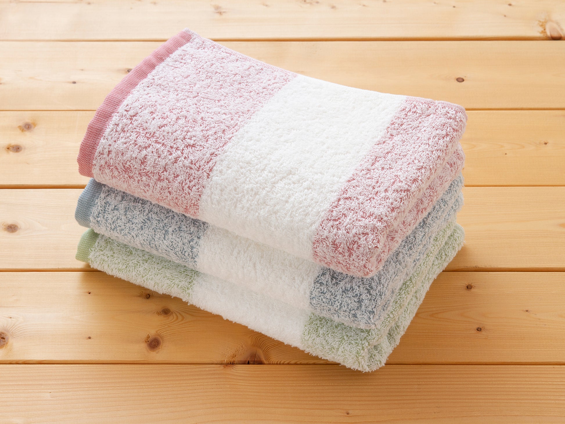 白いパイル糸越しに、ほのかに浮かぶカラーボーダーでおしゃれ度アップ!泉州タオルならではの透かし織りを取り入れたタオルです。
