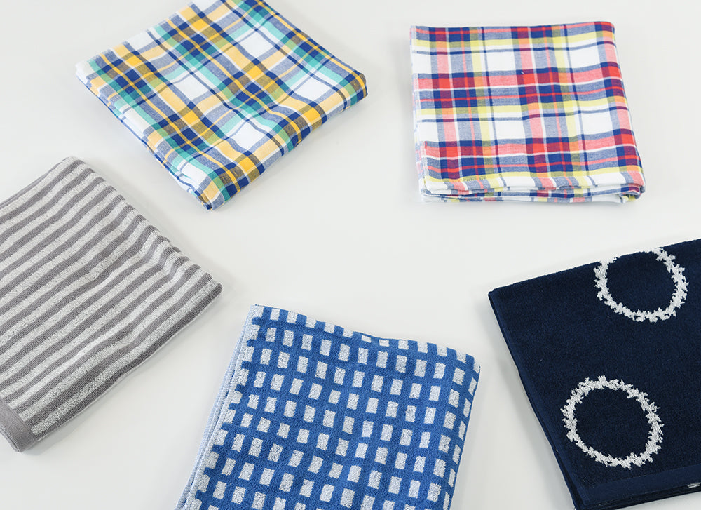 別カートにて同柄のフェイスタオル、チェックやストライプ柄、ガーゼ素材などの展開もございます。