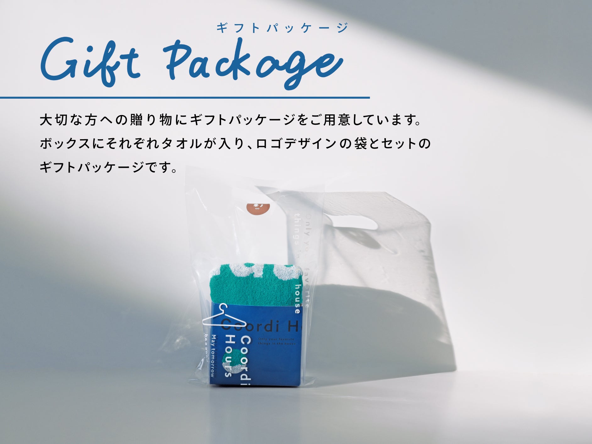 ボックスにそれぞれのタオルが入り、ロゴデザインの袋とセットのギフトパッケージです。