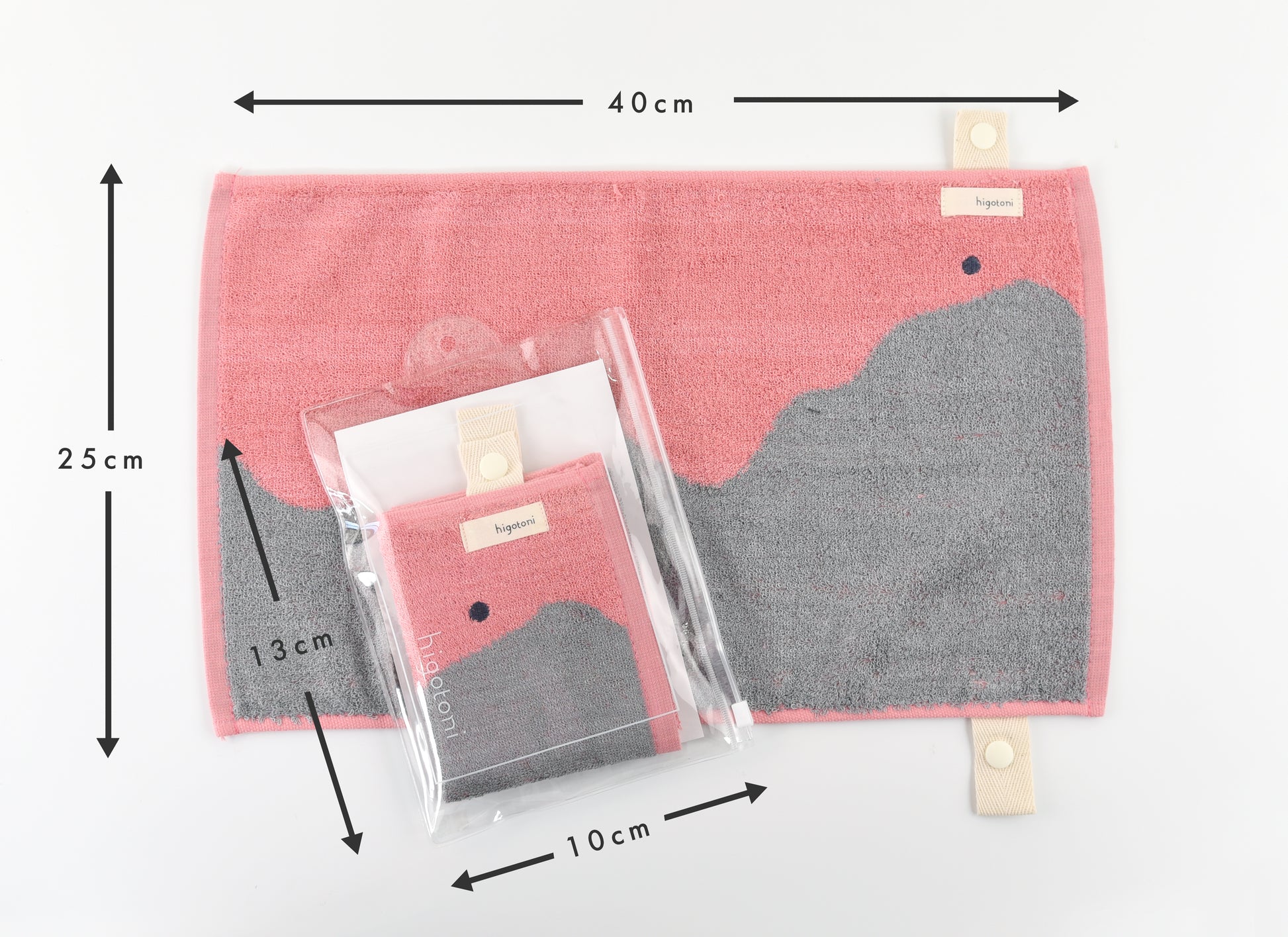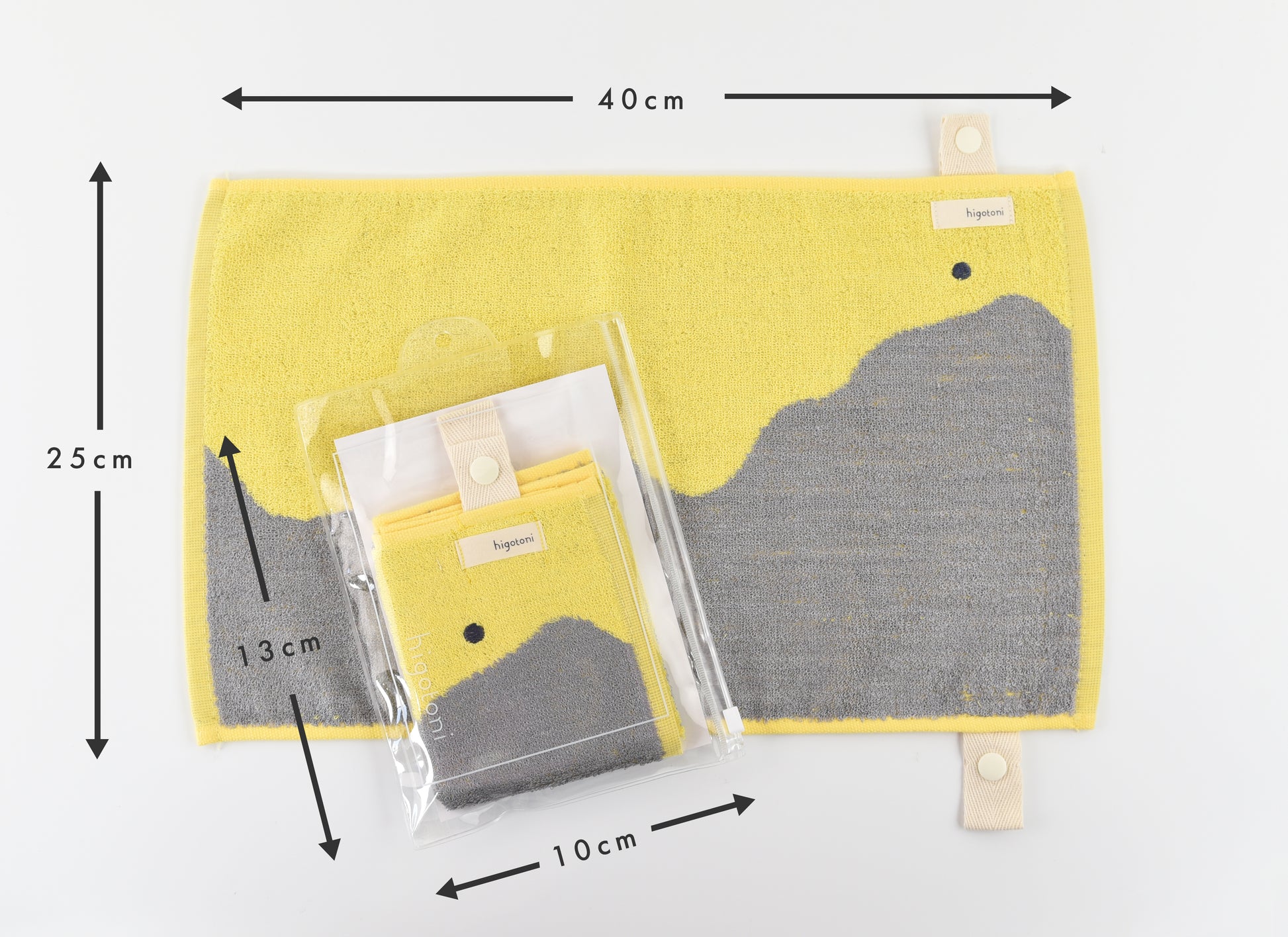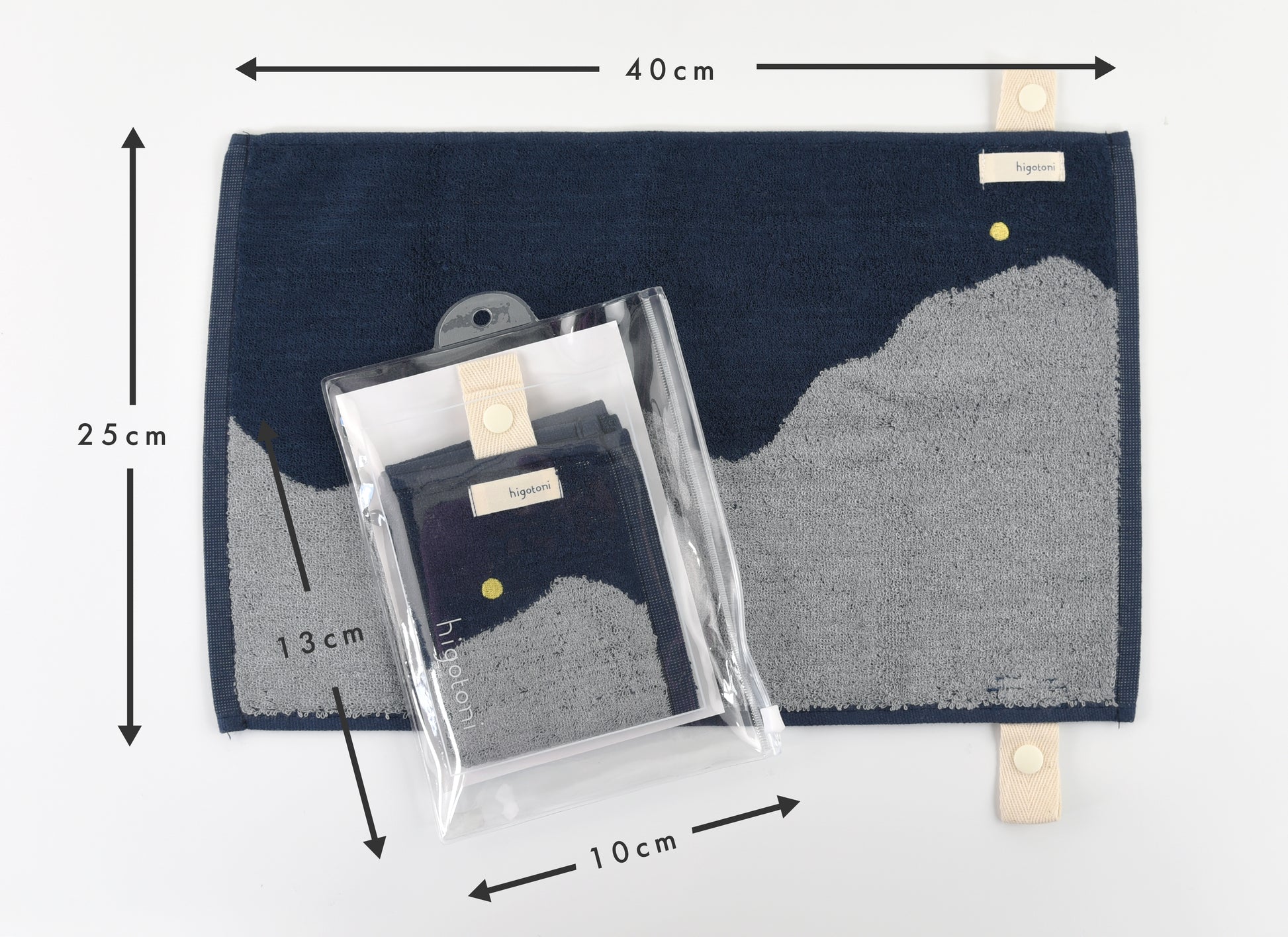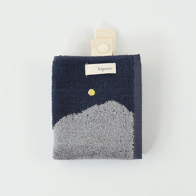 アウトドアにもタウンユースにも映える、山と太陽(月)がモチーフのアース柄。バッグやポケットにしまわないで持ち運べる“身に着けるタオル”