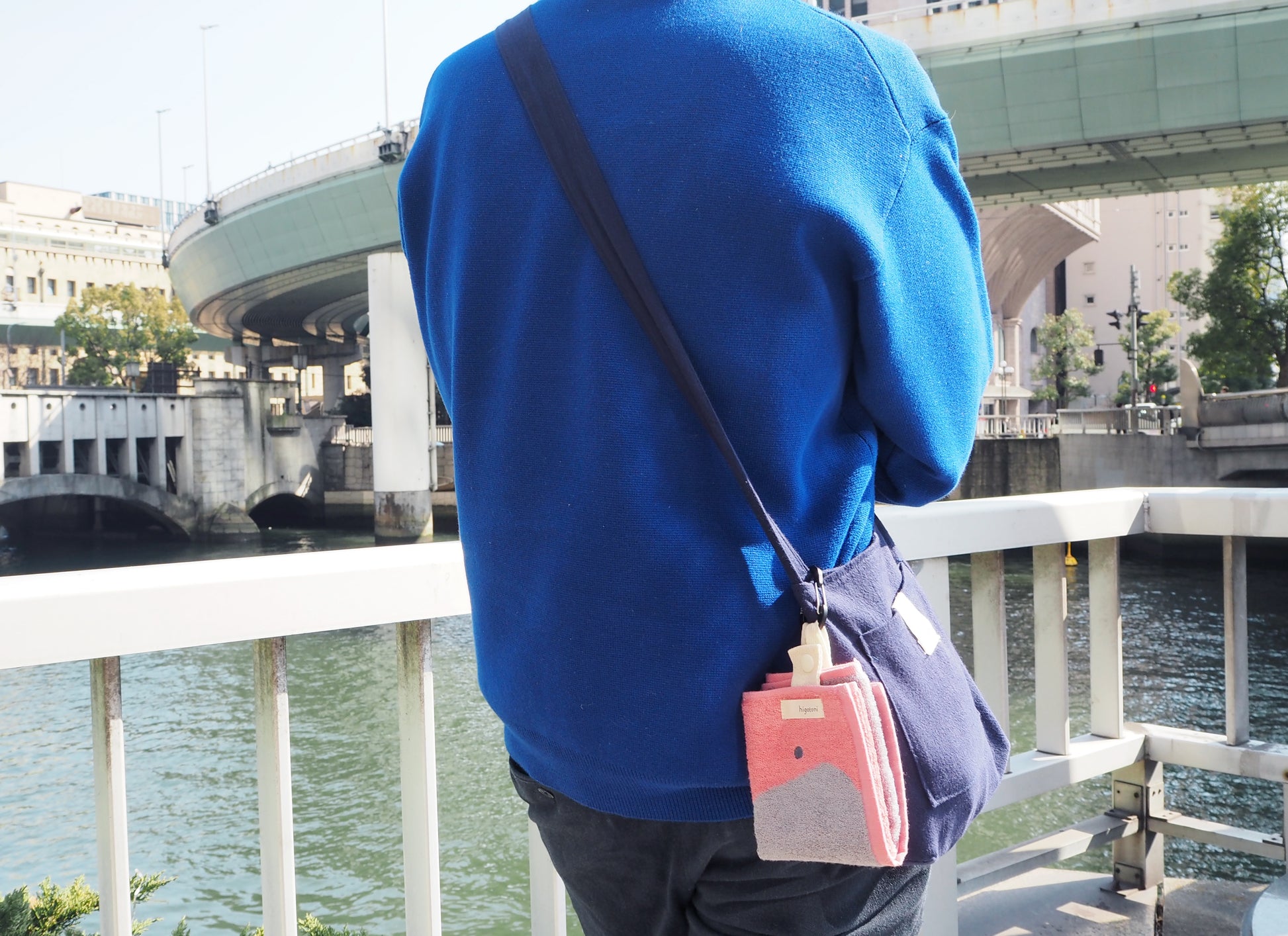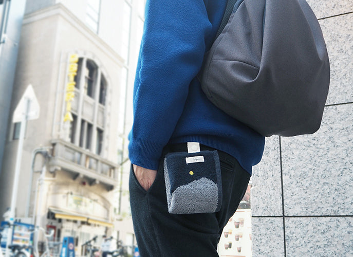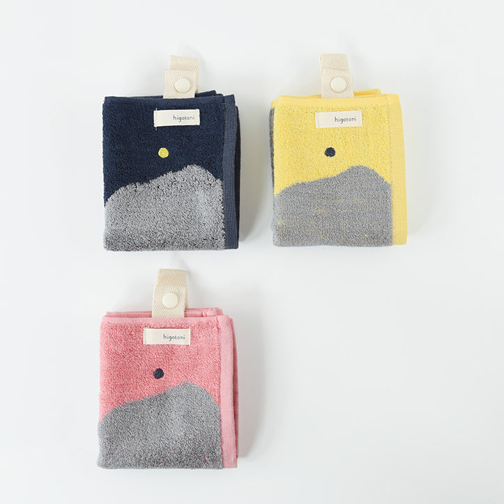 アウトドアにもタウンユースにも映える、山と太陽(月)がモチーフのアース柄。バッグやポケットにしまわないで持ち運べる“身に着けるタオル”