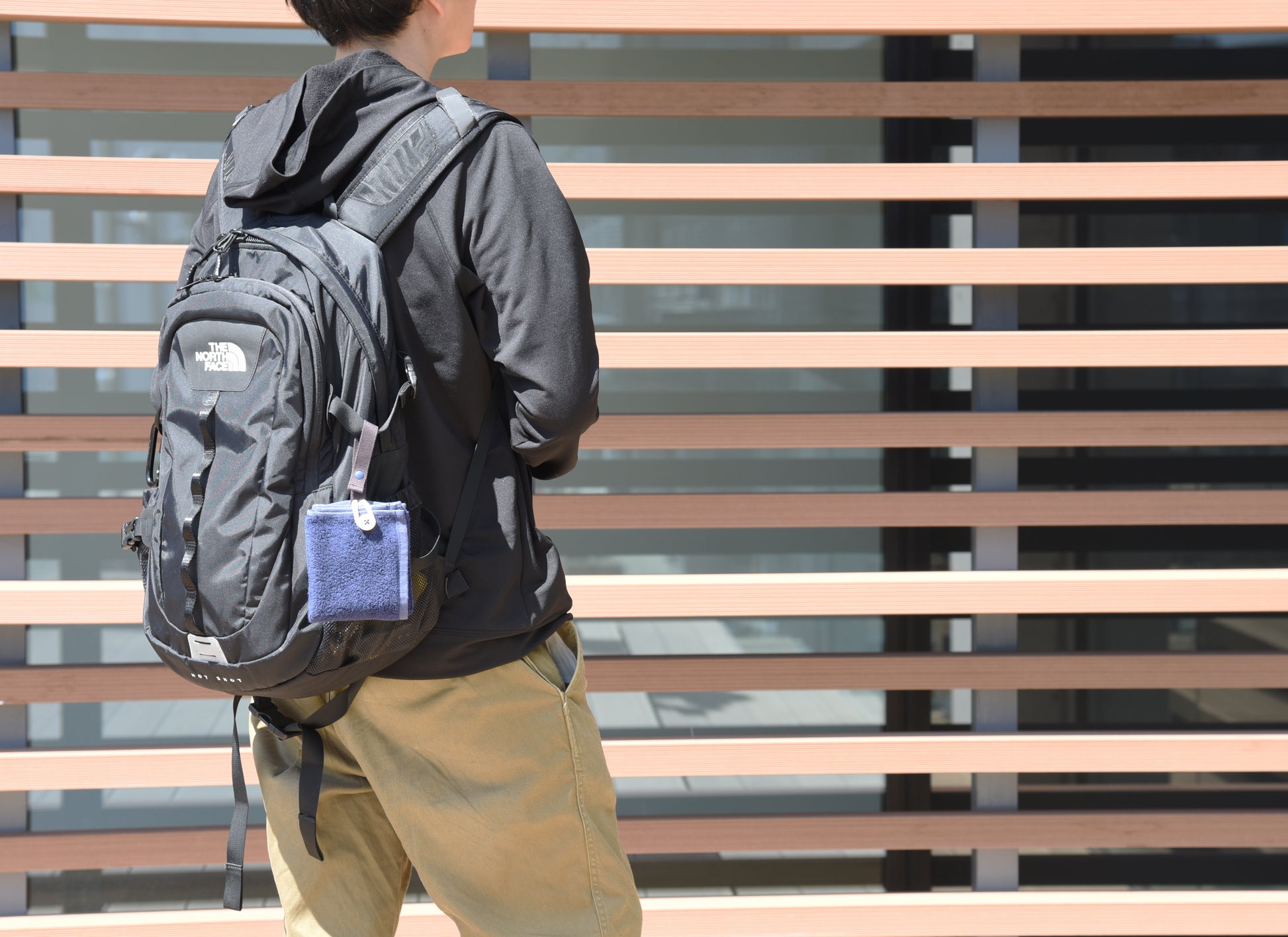 カラビナいらずで、もっと手軽につかえる“身に着けるタオル”