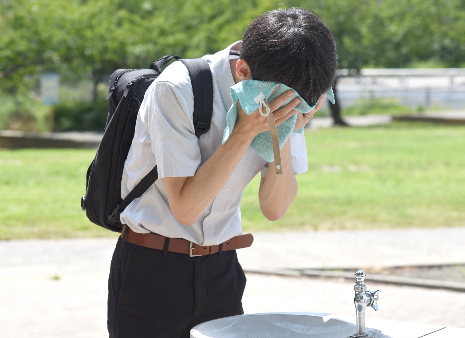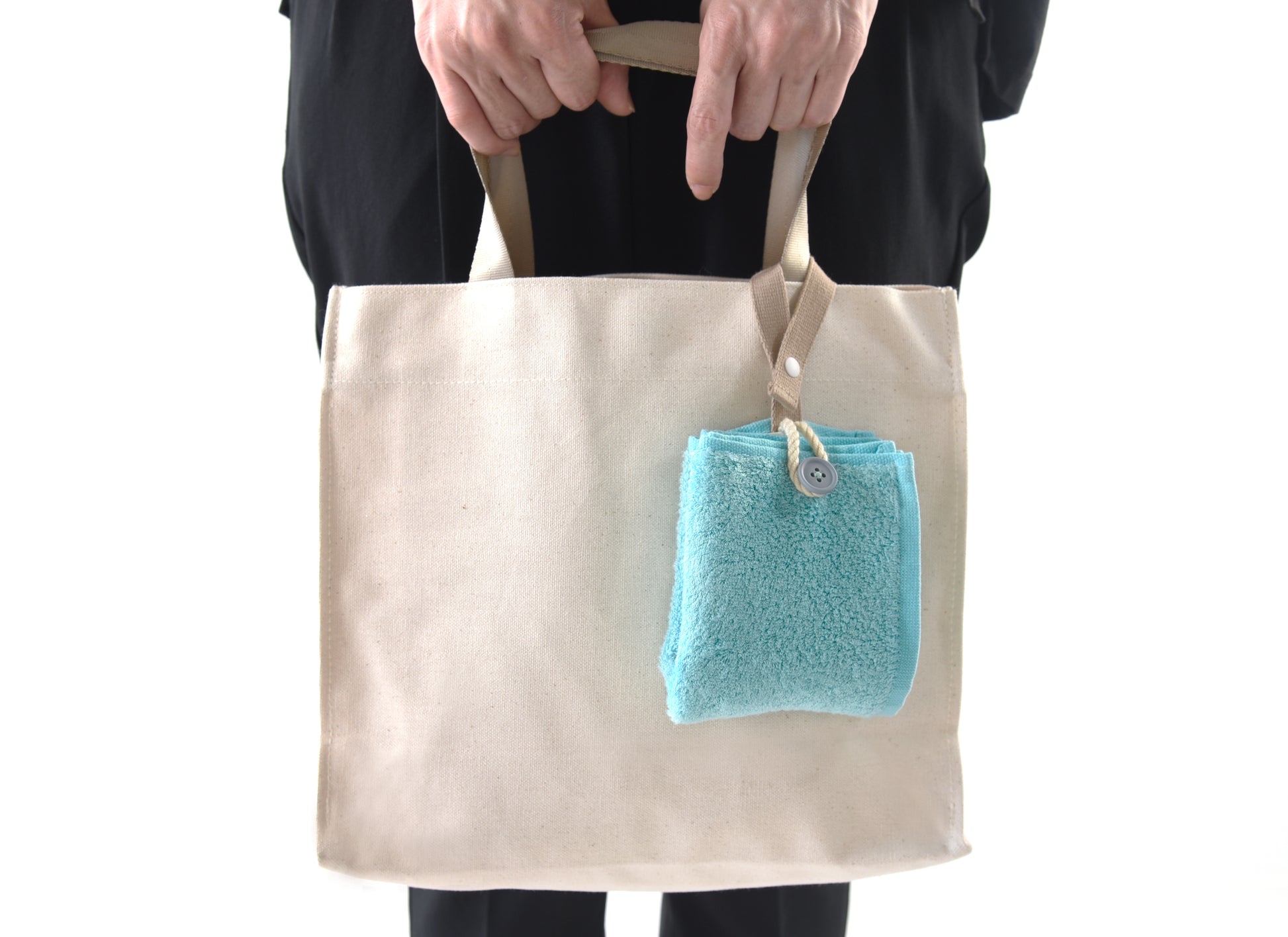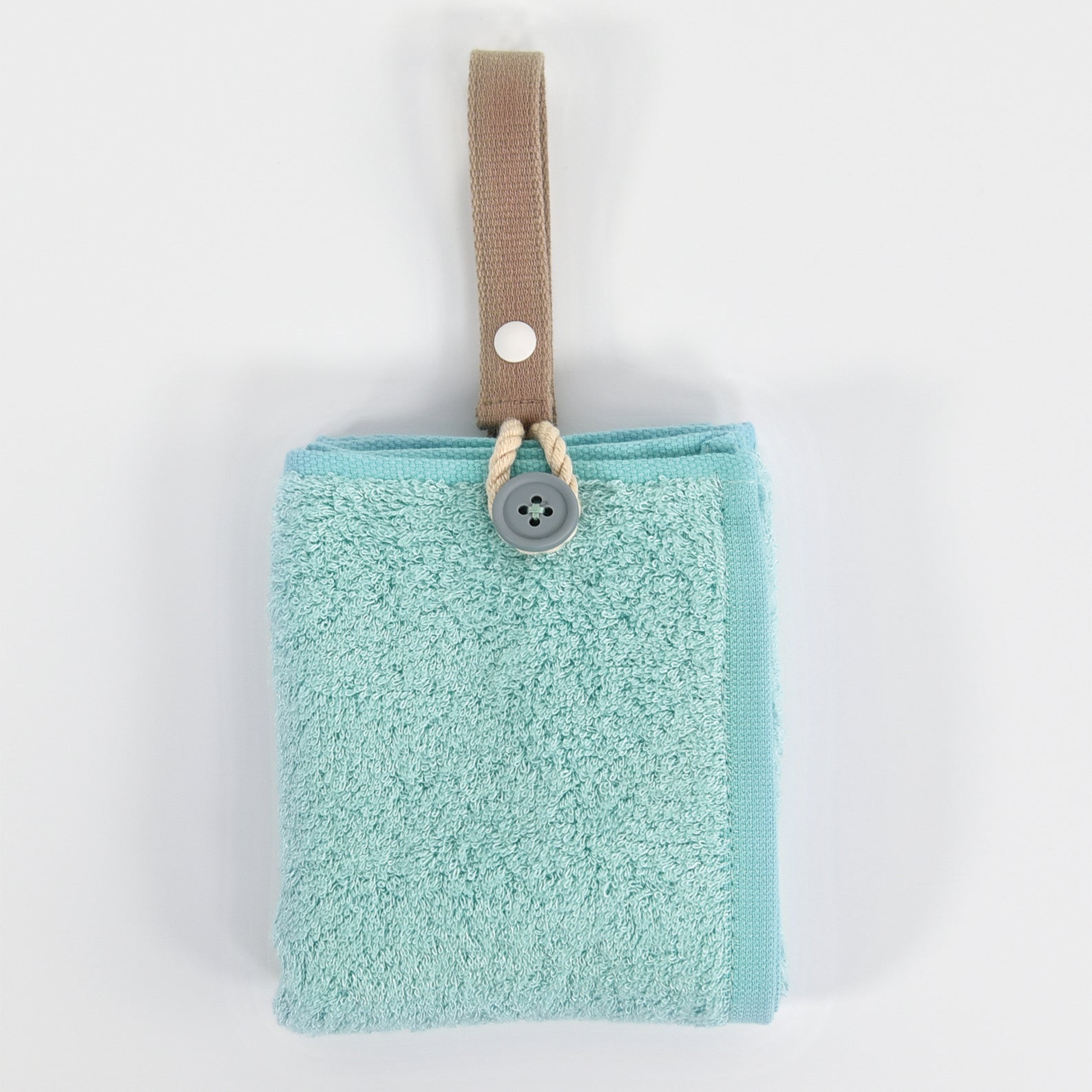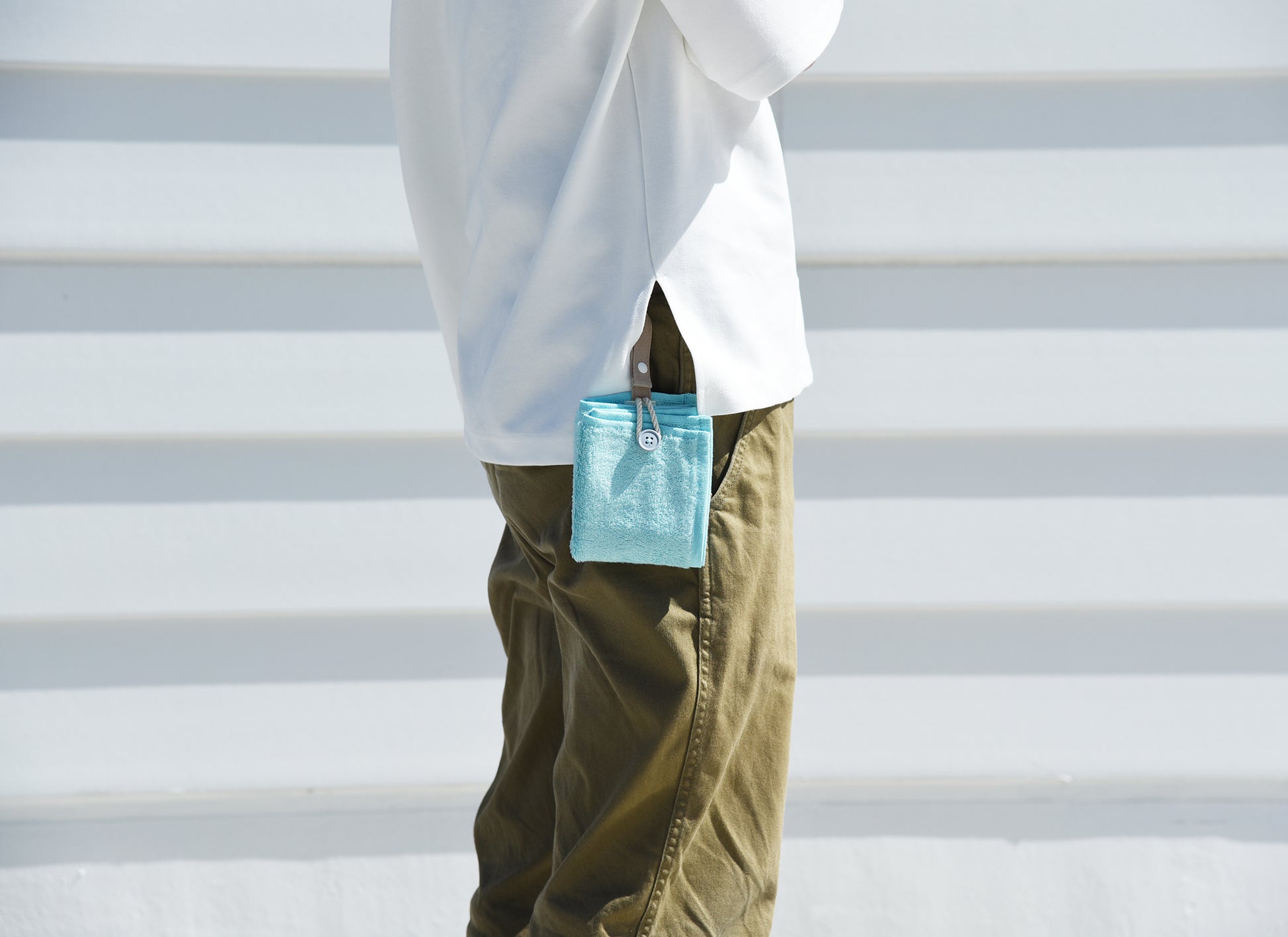 カラビナいらずで、もっと手軽につかえる“身に着けるタオル”
