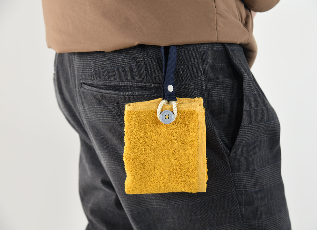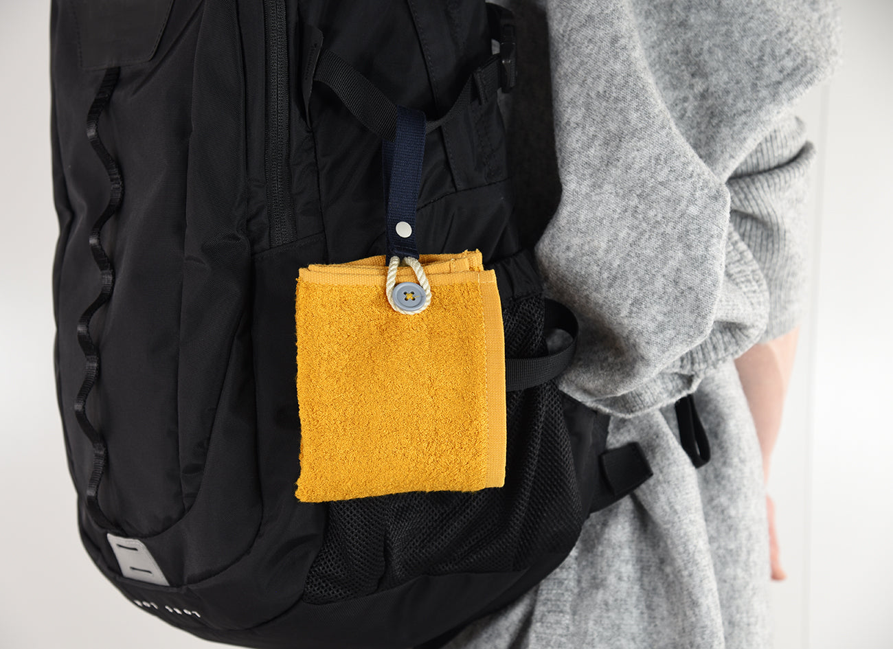 カラビナいらずで、もっと手軽につかえる“身に着けるタオル”