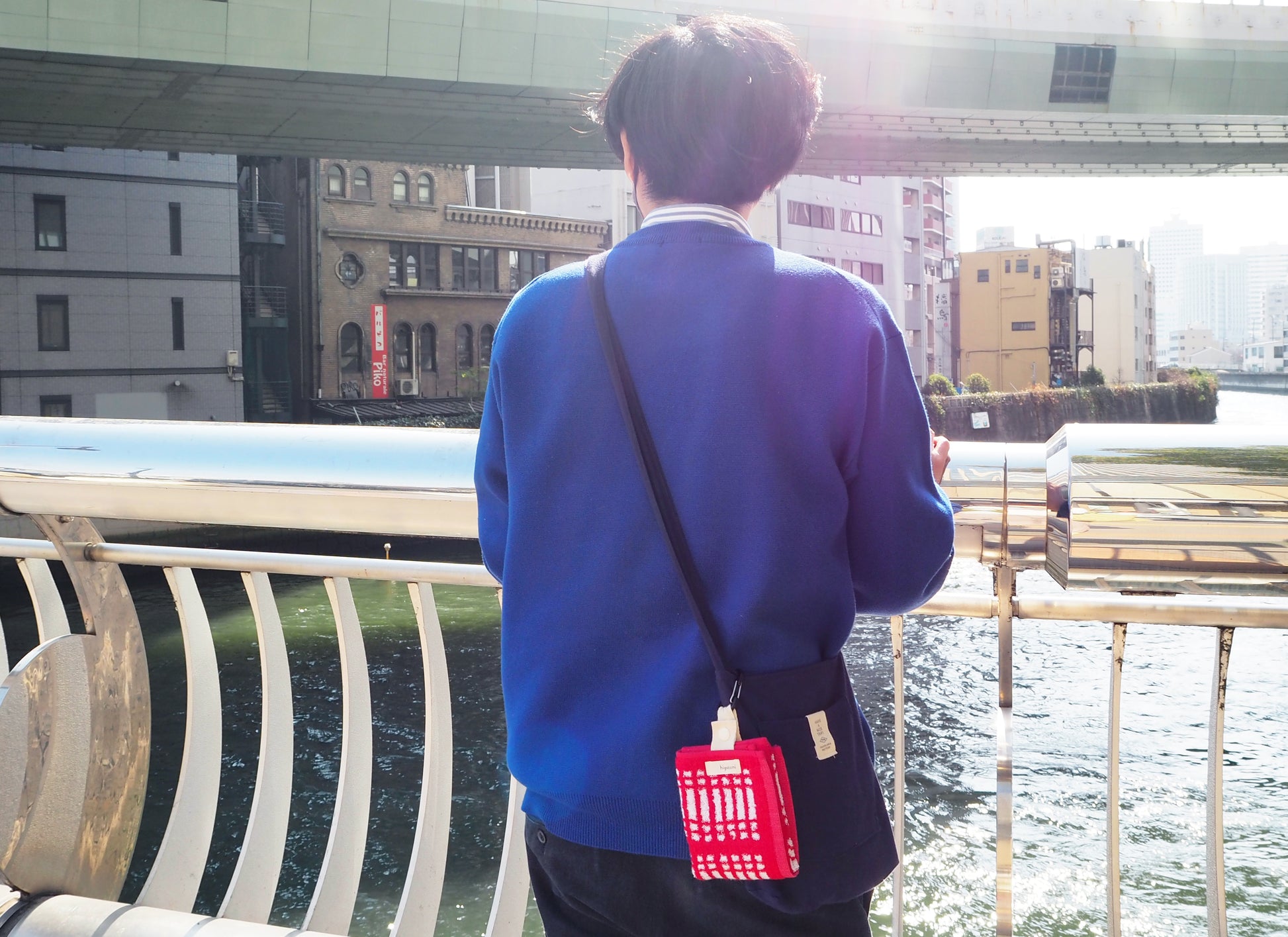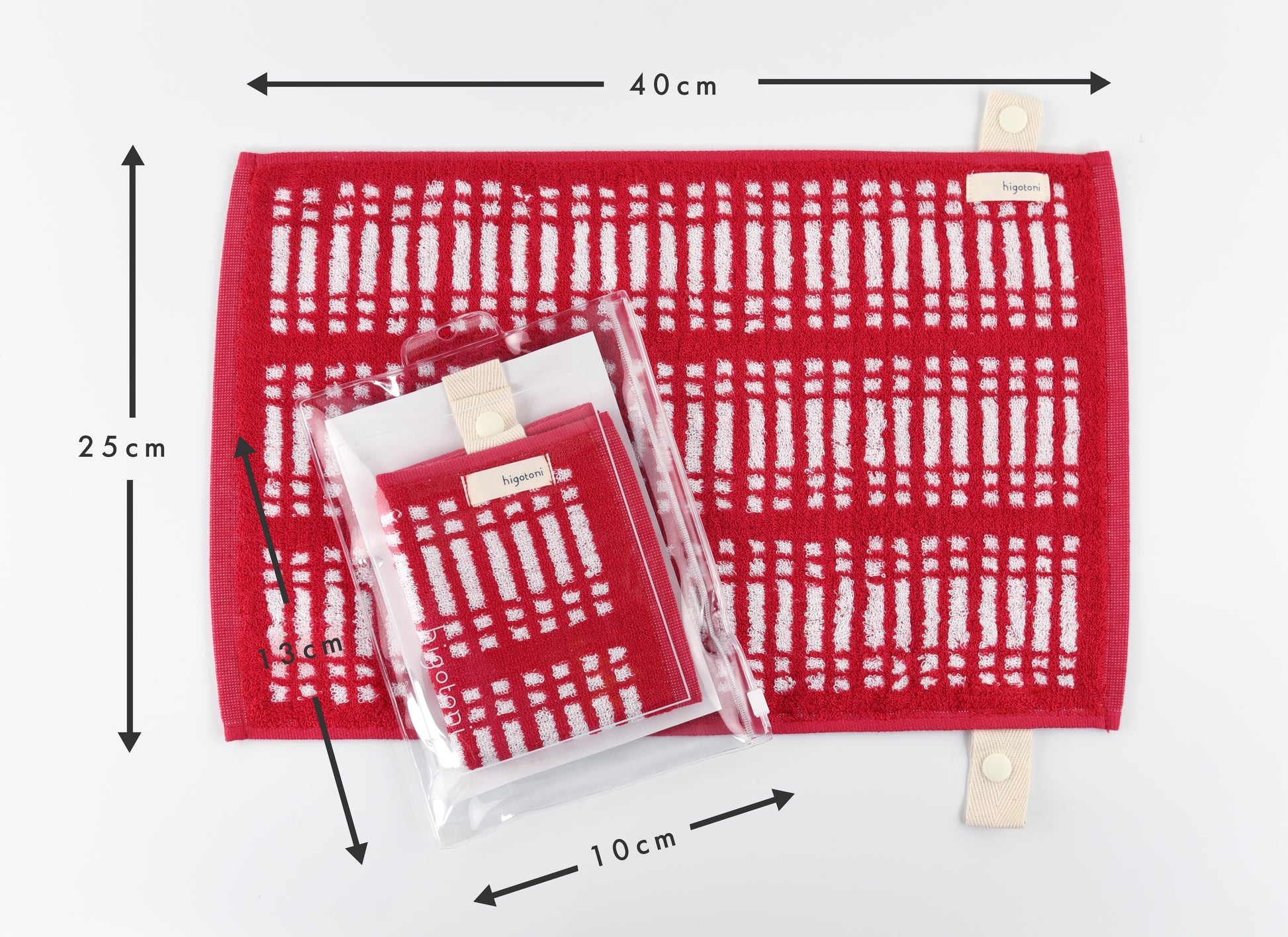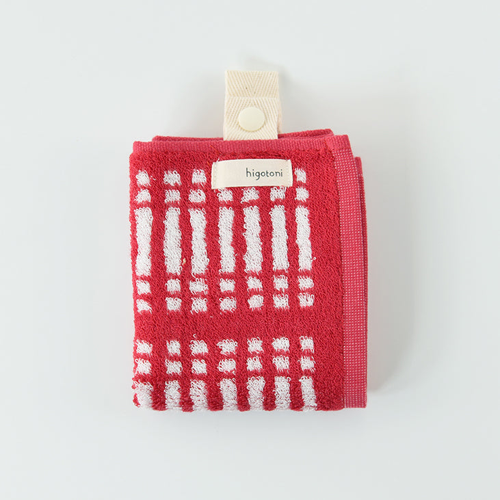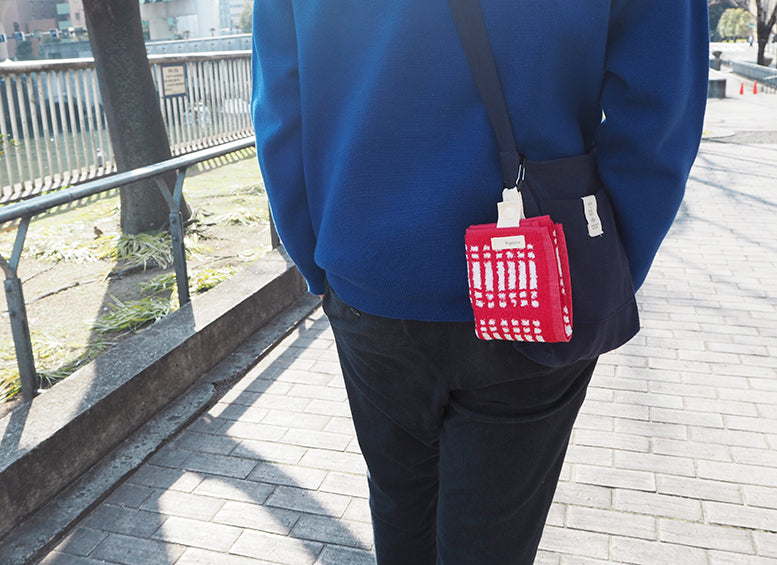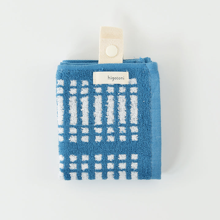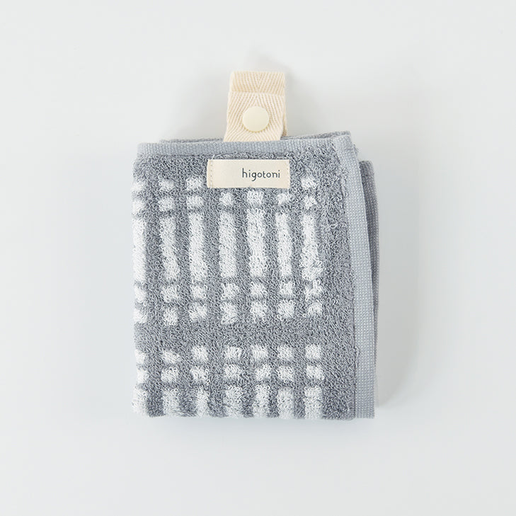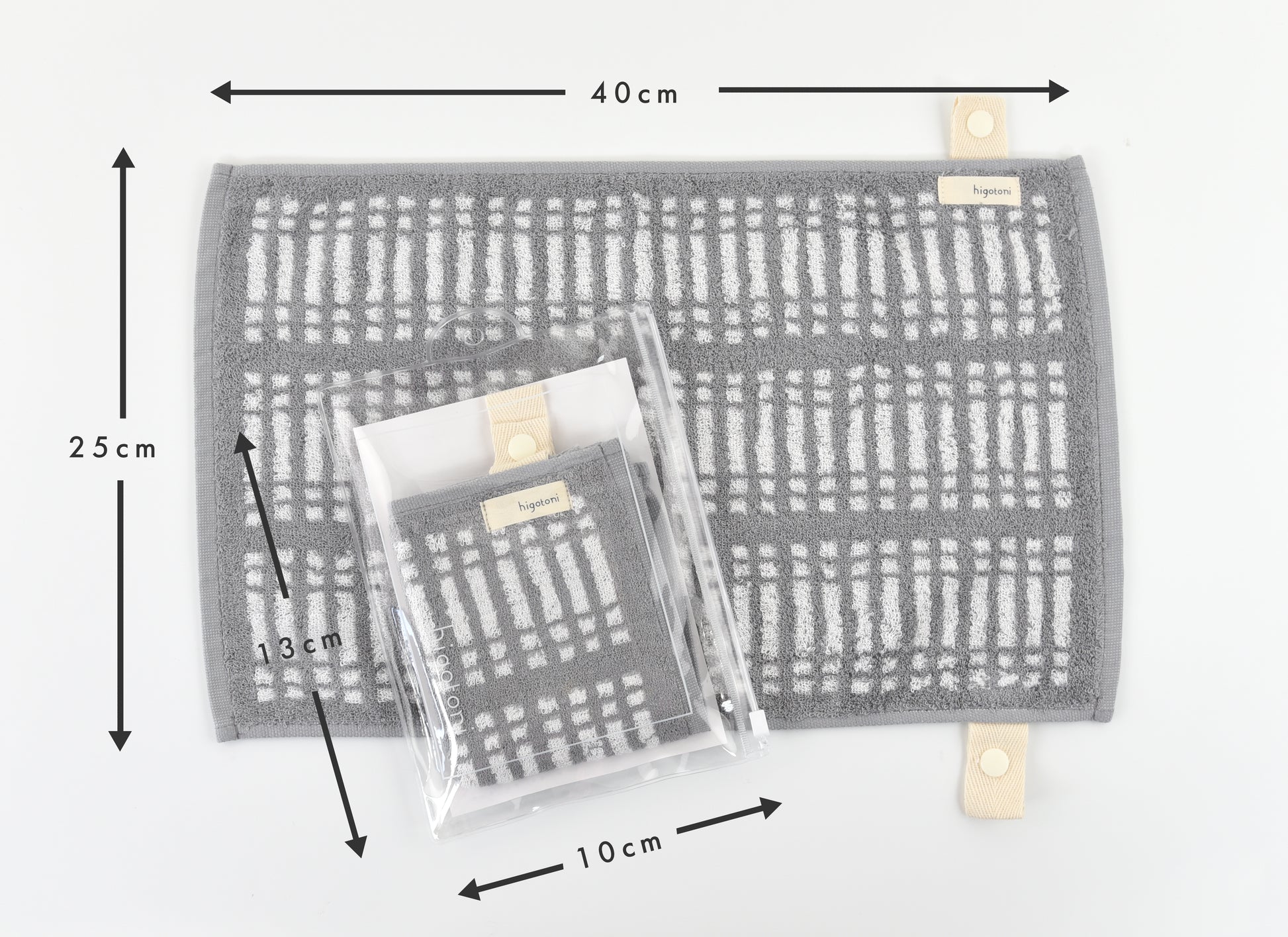 ベーシックでありながら、個性も感じさせる断続的なライン柄。バッグやポケットにしまわないで持ち運べる“身に着けるタオル”