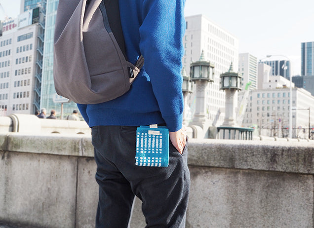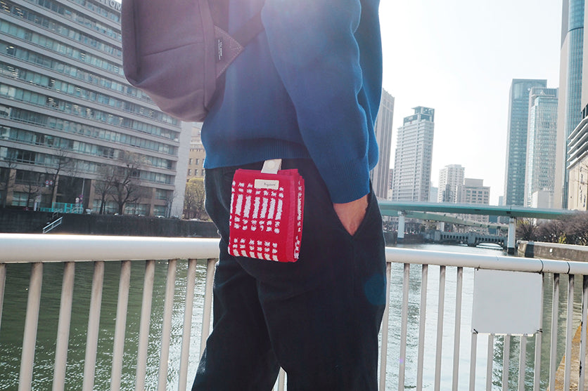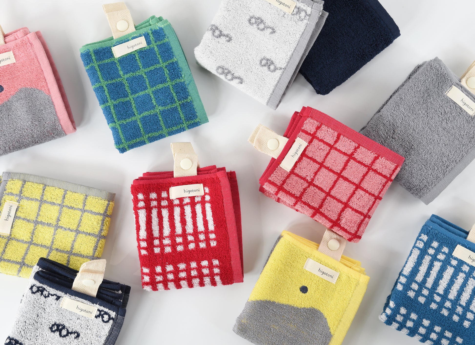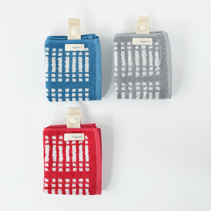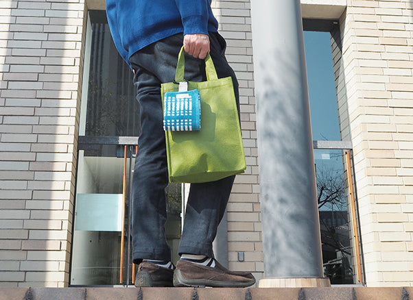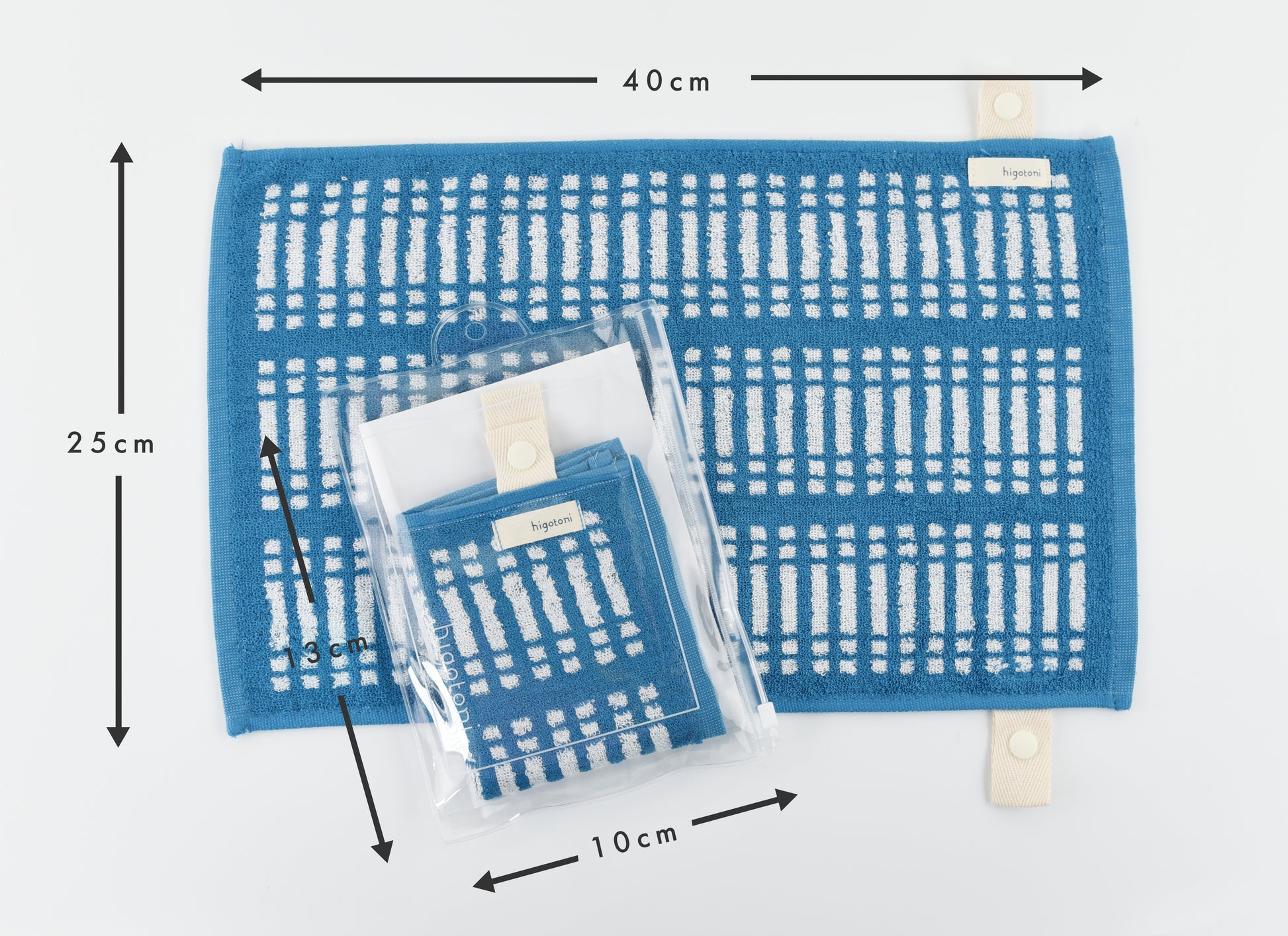 ベーシックでありながら、個性も感じさせる断続的なライン柄。バッグやポケットにしまわないで持ち運べる“身に着けるタオル”