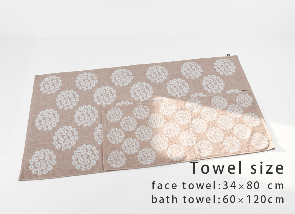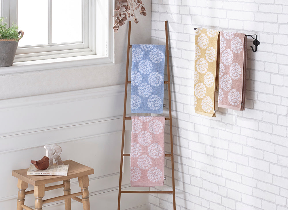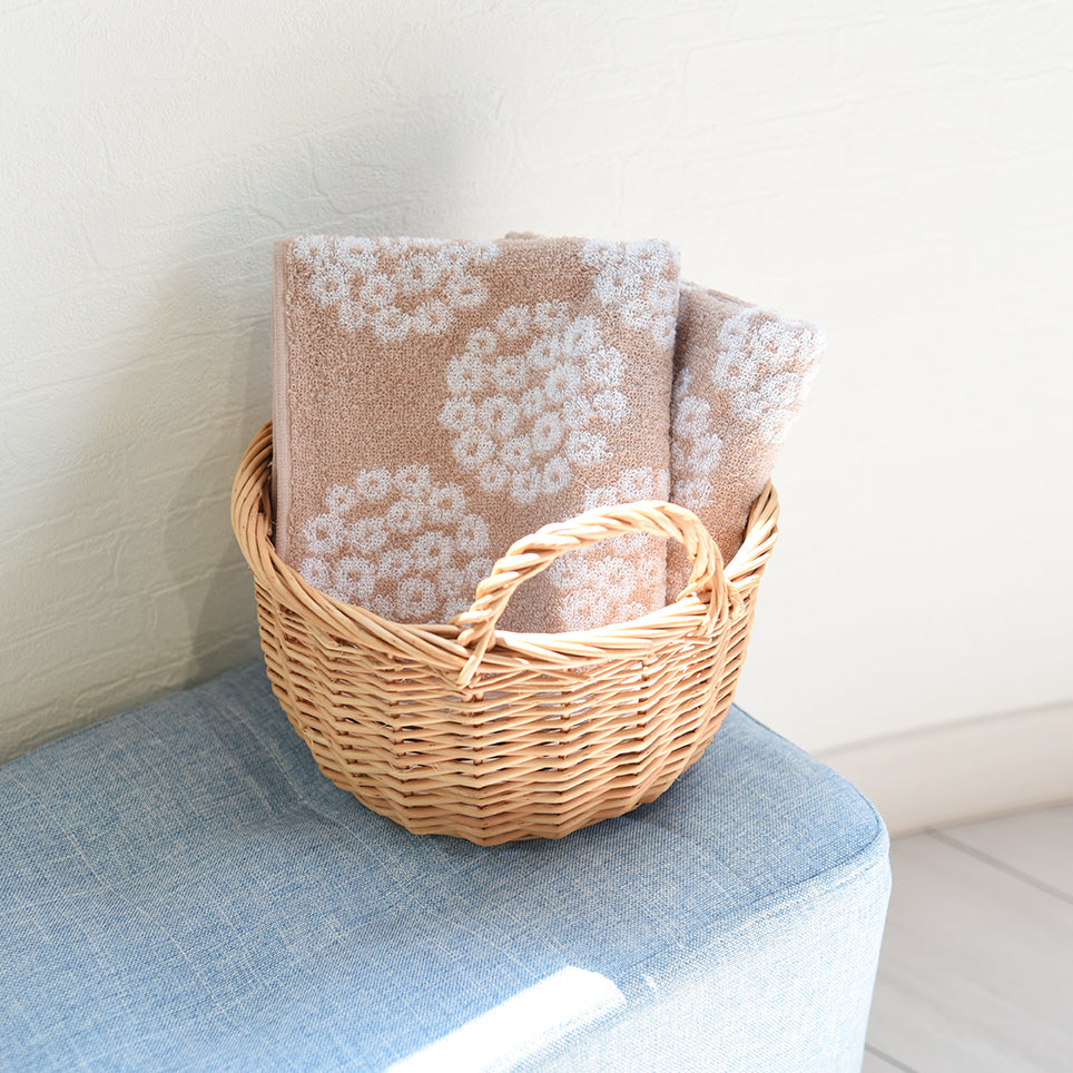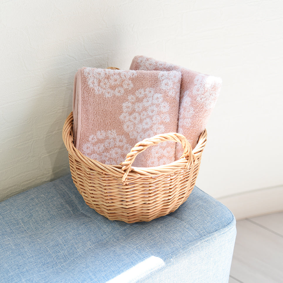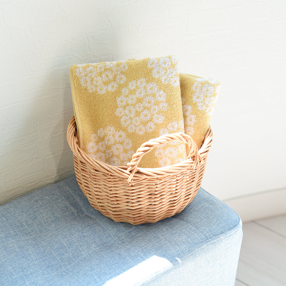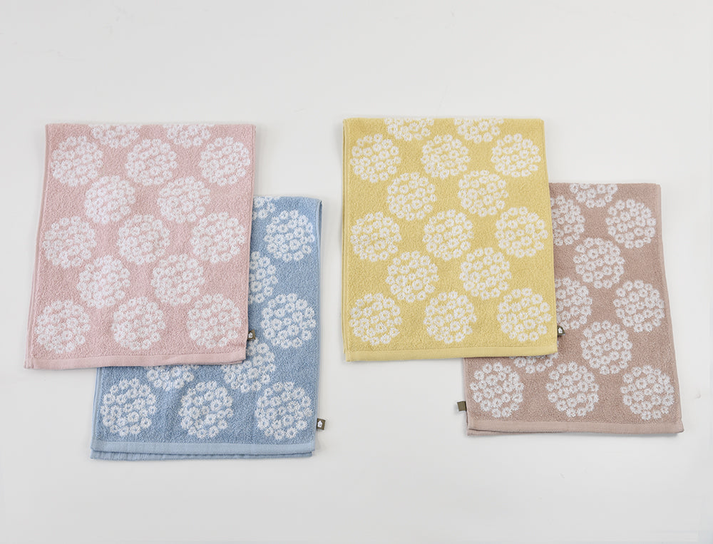 「花束」をモチーフにした北欧風のデザイン。「ピンク/ブルー/イエロー/ベージュ」の4つのカラーからお選びください。別カートにてバスタオルもご用意しています。