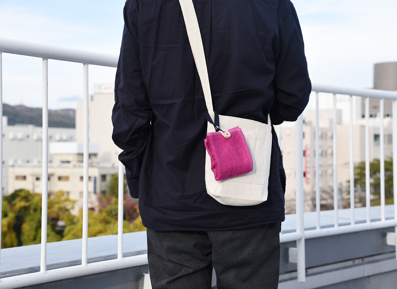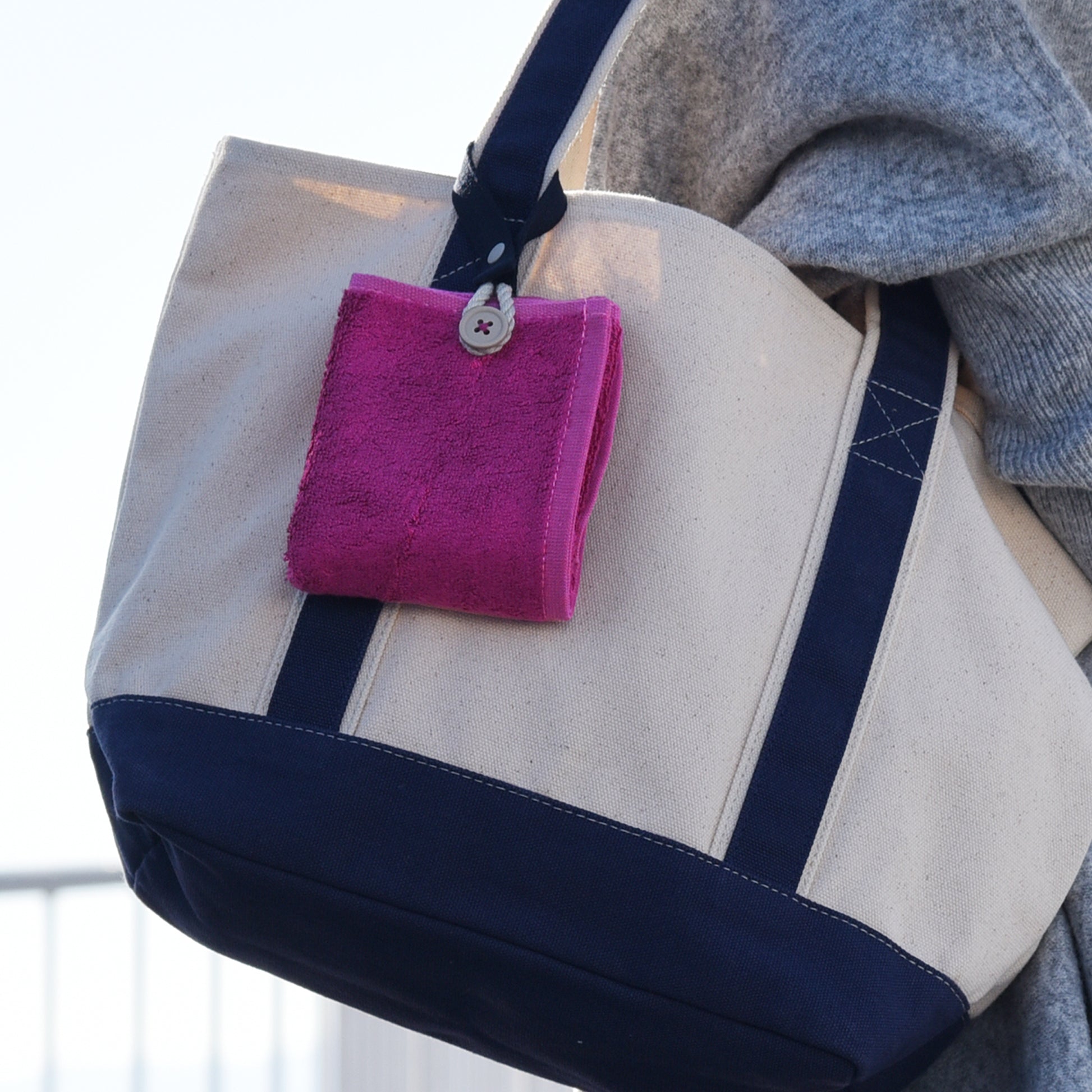 カラビナいらずで、もっと手軽につかえる“身に着けるタオル”