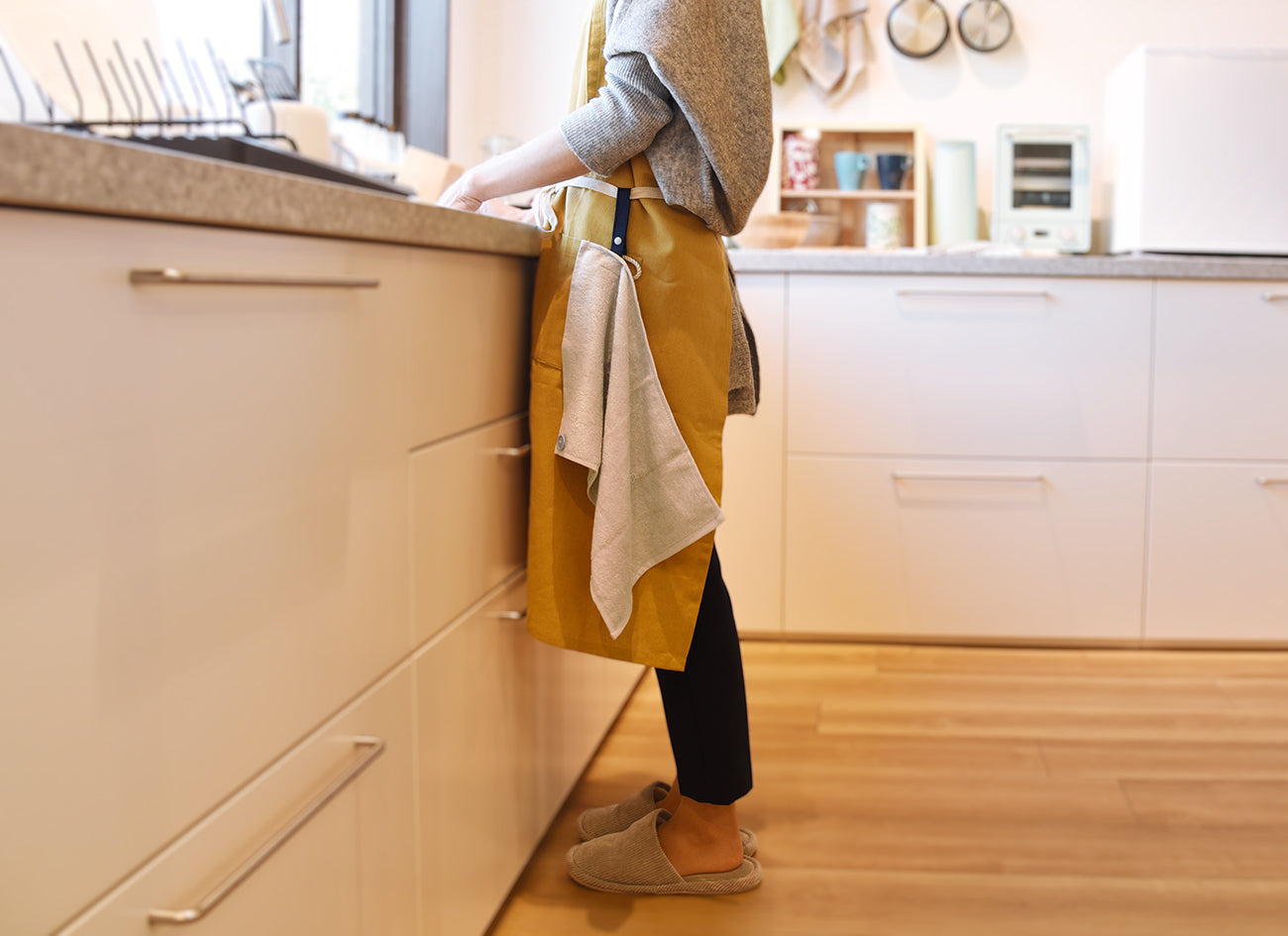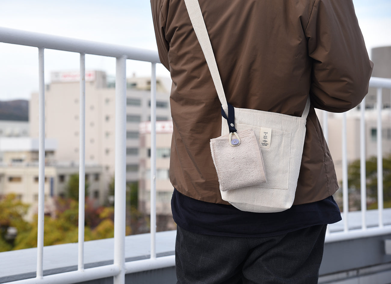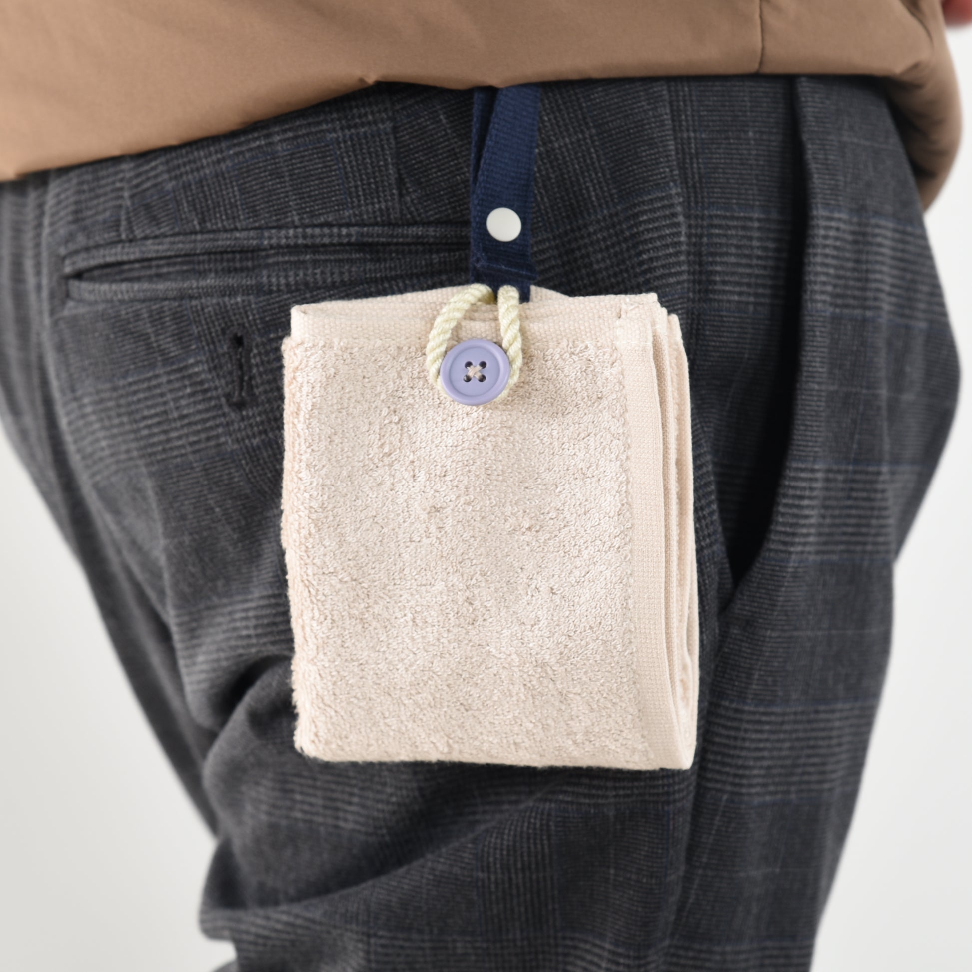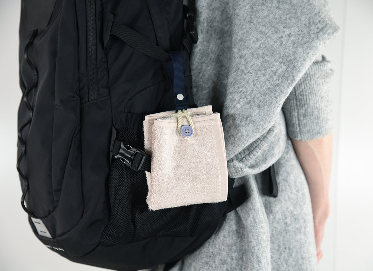 カラビナいらずで、もっと手軽につかえる“身に着けるタオル”